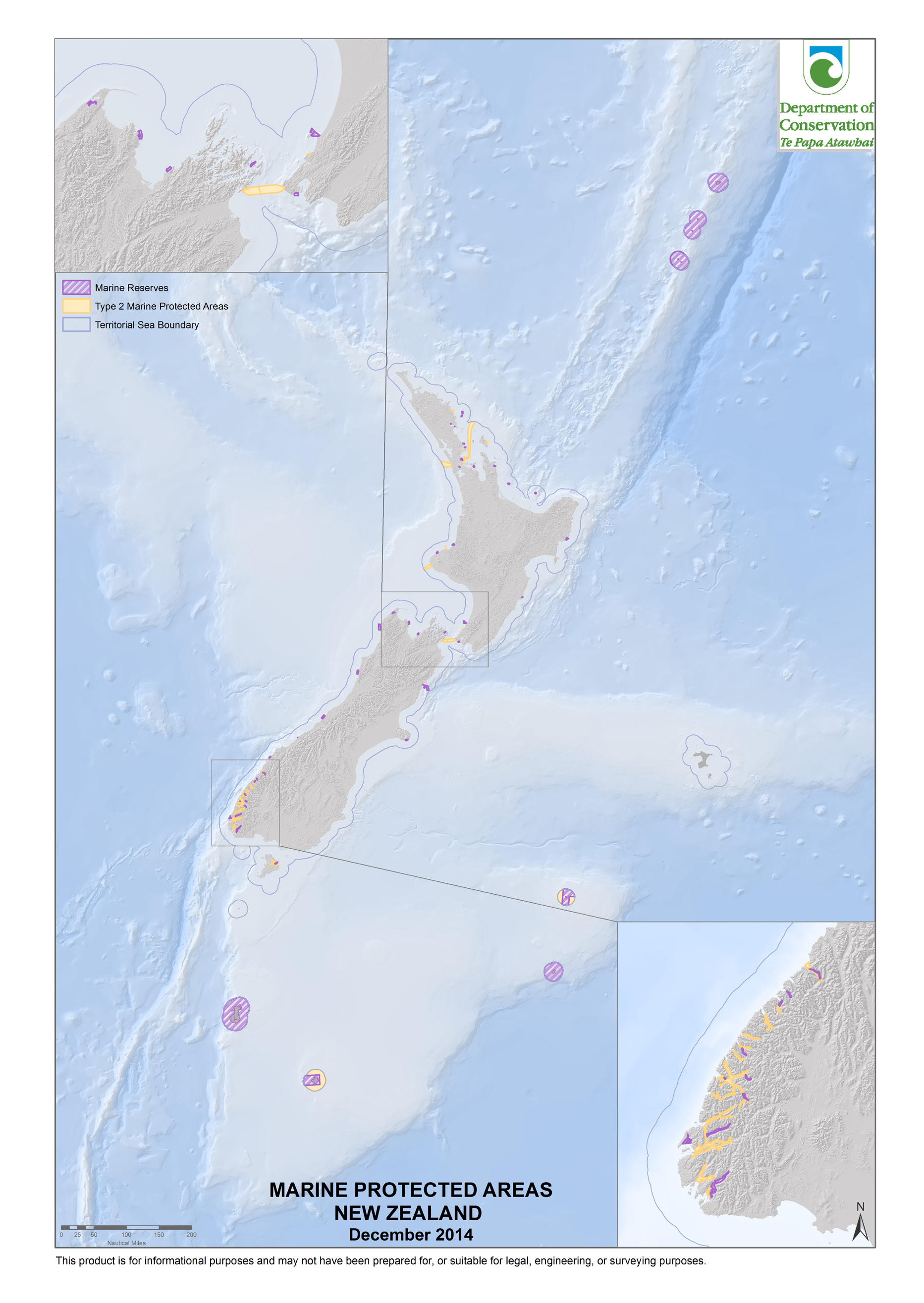 Marine Protected Areas in New Zealand: type 1 (marine reserves) and type 2. Click to view larger (JPG, 990K)