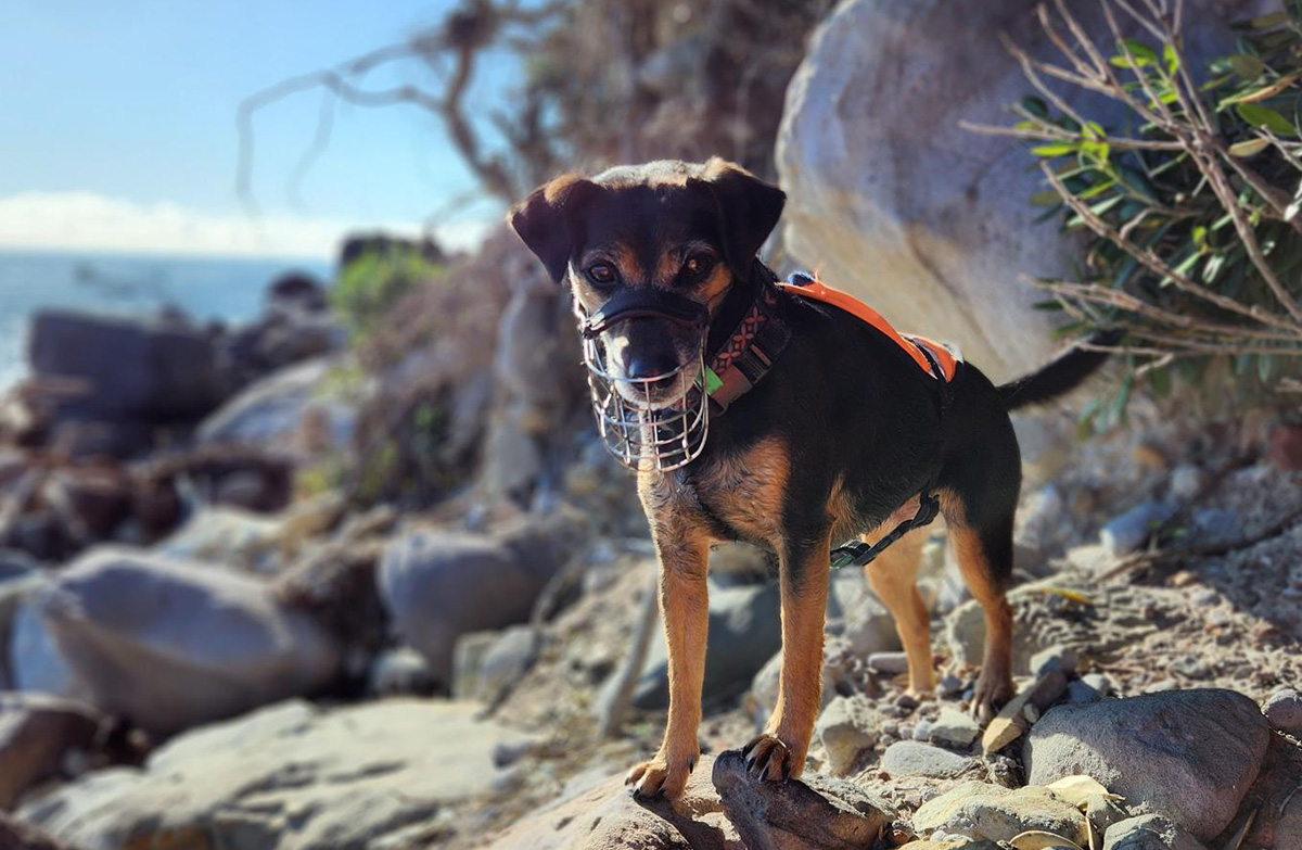 Certified conservation dogs wear vests and muzzles when they are working on public conservation land or in any area where protected species live, such as beaches and dunes.