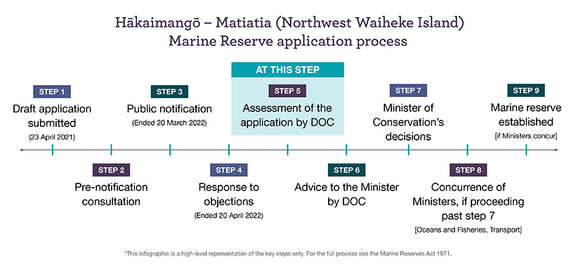 Hākaimangō-Matiatia (Northwest Waiheke) Marine Reserve application process diagram. The steps are expanded below.