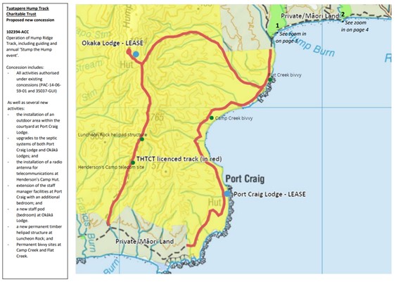 - The continued operation of public (and staff) accommodation at Port Craig and Okaka Lodges and associated infrastructure for the Hump Ridge Track operation, for a 30-year term