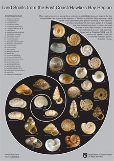 It is thought that New Zealand may have 3 - 5 times the snail diversity of most other countries in the world, when calculated on a per unit area basis. For some species, two different views of the same specimen are shown.