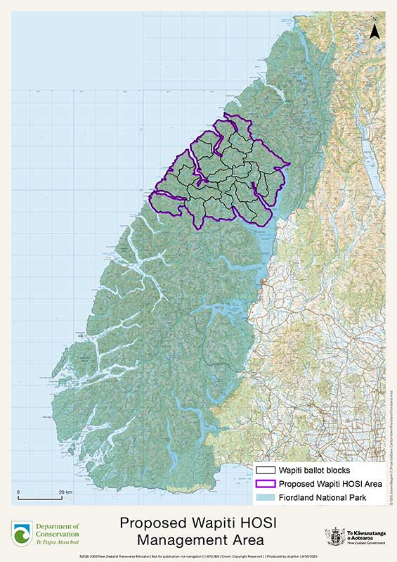Proposed area: 190,700 hectares of Fiordland National Park. This reflects the location and boundaries of the existing ‘Wapiti Area’ in Fiordland National Park.