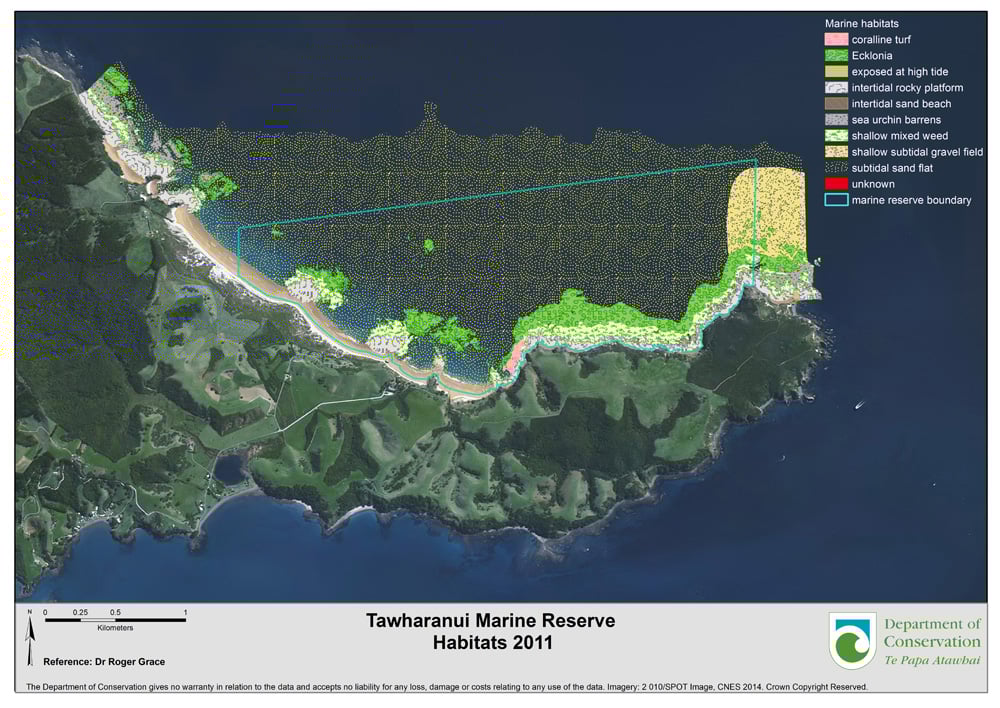 Tāwharanui Marine Reserve contains a wide variety of habitats typical of the northeastern biogeographic region. These include: exposed beaches with tuatua and scallop beds, boulder beaches with caves and archways, and extensive rocky reefs with rock pools exposed at low tide.