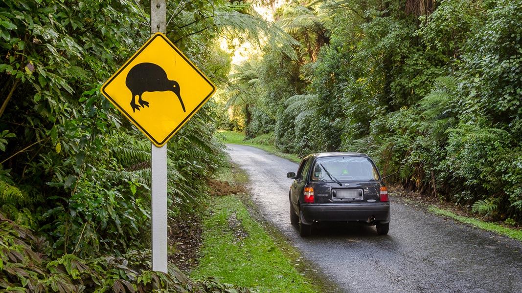 - Drive carefully through kiwi habitat (look out for the distinctive yellow kiwi road sign).