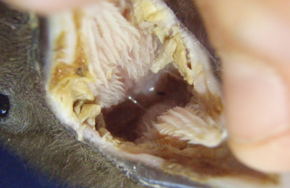 A bacterial infection called diphtheritic stomatitis, or avian diphtheria, can affect the mouths of hoiho chicks. It prevents them from feeding and drinking and lead to more illnesses and death.