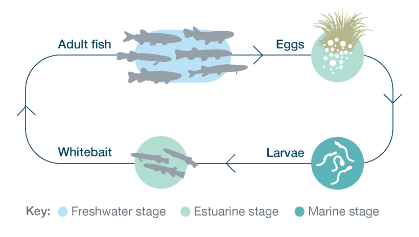 Kōaro are migratory galaxiids and move between streams, rivers and the sea during their lifecycle. They are one of the six species of native fish caught as whitebait as they enter rivers and streams to begin their upstream migration.