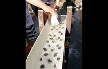 Macrophthalmia migrate further downstream at night when the river is flowing rapidly, which accelerates their journey. By the time they reach the sea in July–August, the fish are about 80–120 mm long.