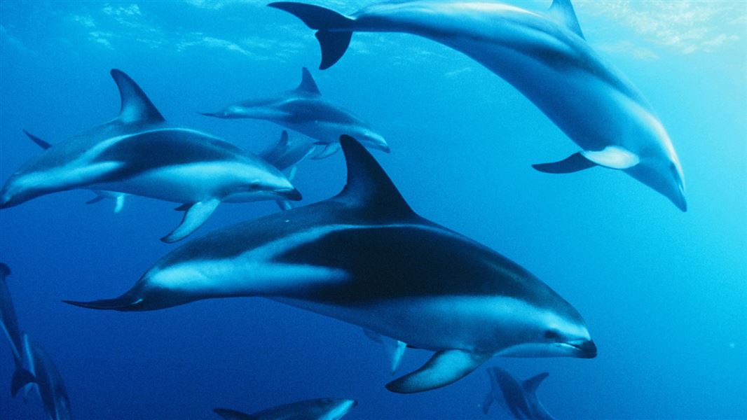 Dusky dolphins interact with a variety of other marine mammals including common dolphins, long-finned pilot whales, bottlenose dolphins, Hector’s dolphins, killer whales, New Zealand fur seals, sperm whales, Southern right whales and humpback whales.