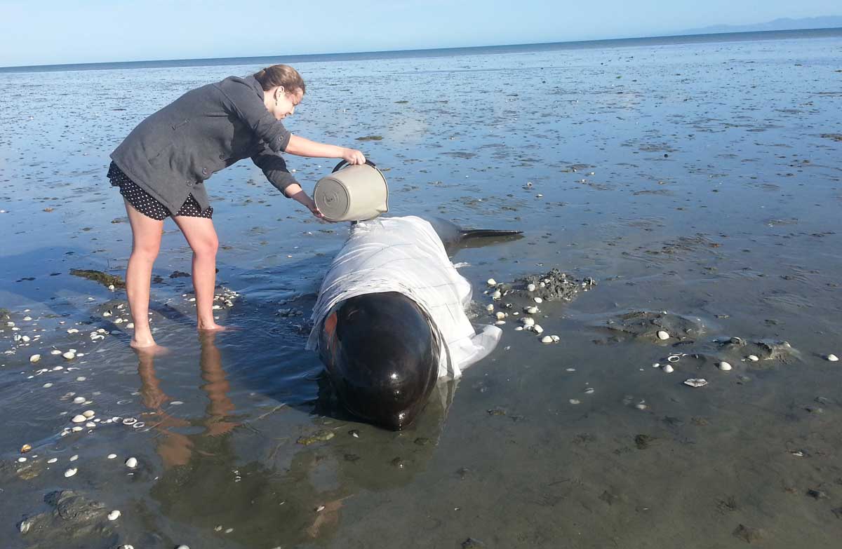 - In suitable conditions (ie, not too windy), cover animals with wet sheets and begin gently bucketing water onto them. Do not cover the blow hole or pour water into the opening (to prevent this, wait until the animal has taken a breath before pouring). Concentrate on flippers and flukes.