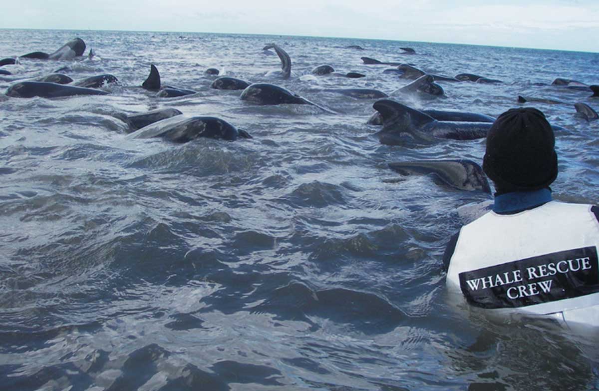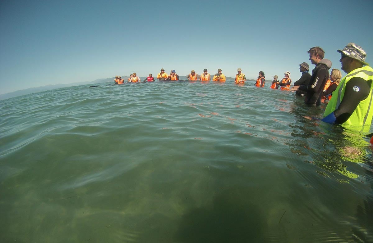 - You may be asked to form a human chain parallel to the shore, creating a barrier between the animals and the beach. If you are, ensure you remain in a comfortable depth of water, and not above shoulder height when standing. Stay in line in the human chain. At this stage, animals may become defensive of the pod and may become agitated or aggressive if approached. This may be displayed as tail slapping, swimming close by, or opened mouth lunging.