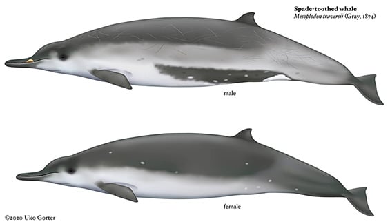 A scientific illustration of the male and female spade-toothed whales