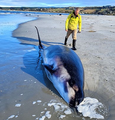 DOC ranger Jim Fyfe examines the male spade-toothed whale that washed ashore at Taiari mouth, Dunedin, in July 2024