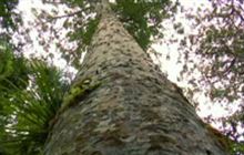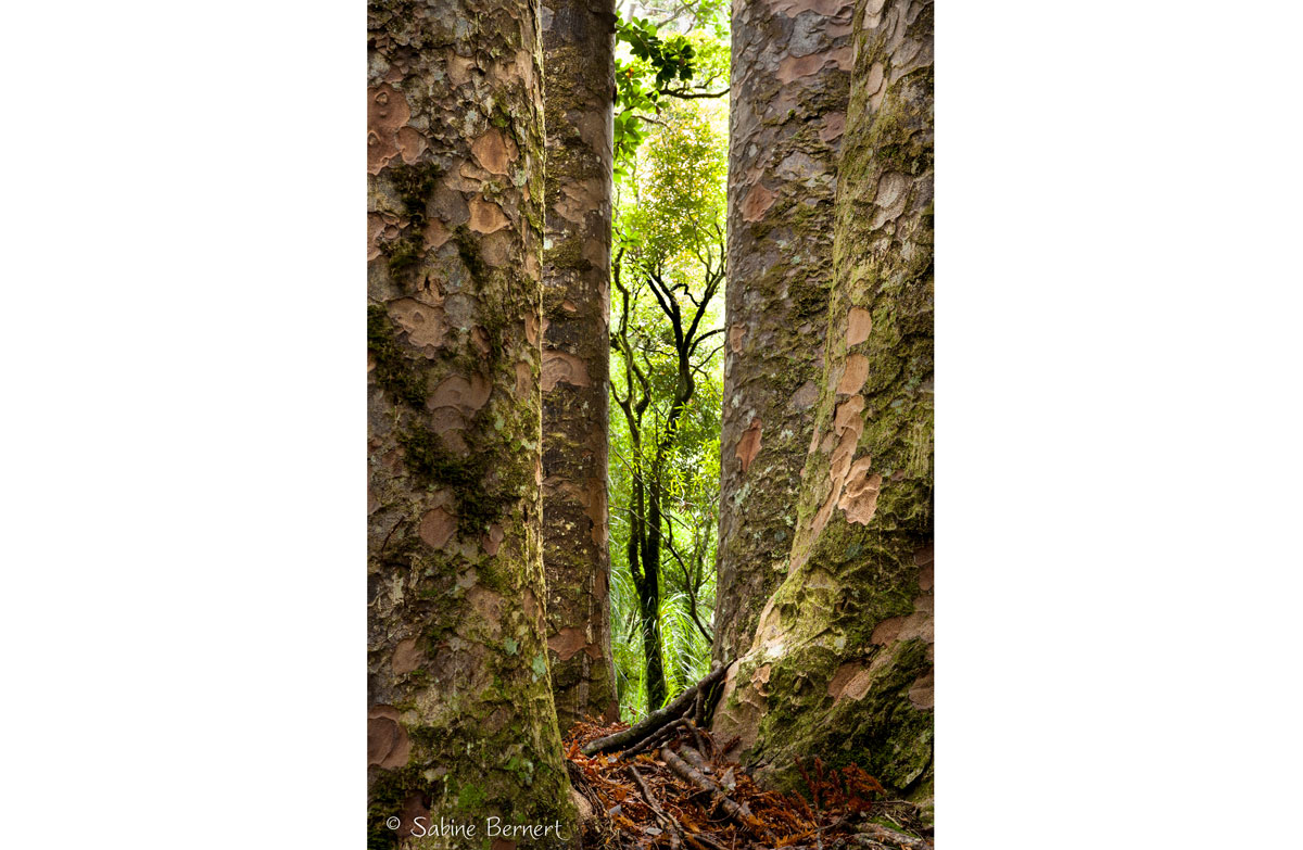 Adolescent trees have straight pole trunks and a distinctive narrow conical crown. As the trees mature the trunk thickens and the lower branches are shed, resulting in the clean, straight trunk of the adult kauri.