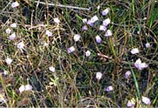 Both Utricularia species have broad spoon-shaped green leaves up to 2.5 cm long that lie flat on the ground. They are most noticeable over summer when they send up 10 cm tall stems with mauve or whitish flowers.