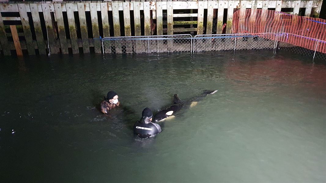 The orca calf was shifted into a temporary holding pool around 8pm on Thursday 15 July as sea swells increased and concerns grew the animal would be buffeted against fixed structures around its temporary pen – including two wooden wharves and a concrete slip ramp.