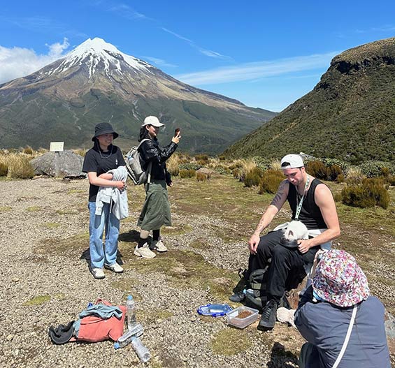 In the image, the man is shown feeding a pet cat seated on his lap – with Mt Taranaki/Taranaki Maunga clearly visible in the background. Other visitors are shown watching the man, with one visitor appearing to take a photo of the cat enjoying its meal.