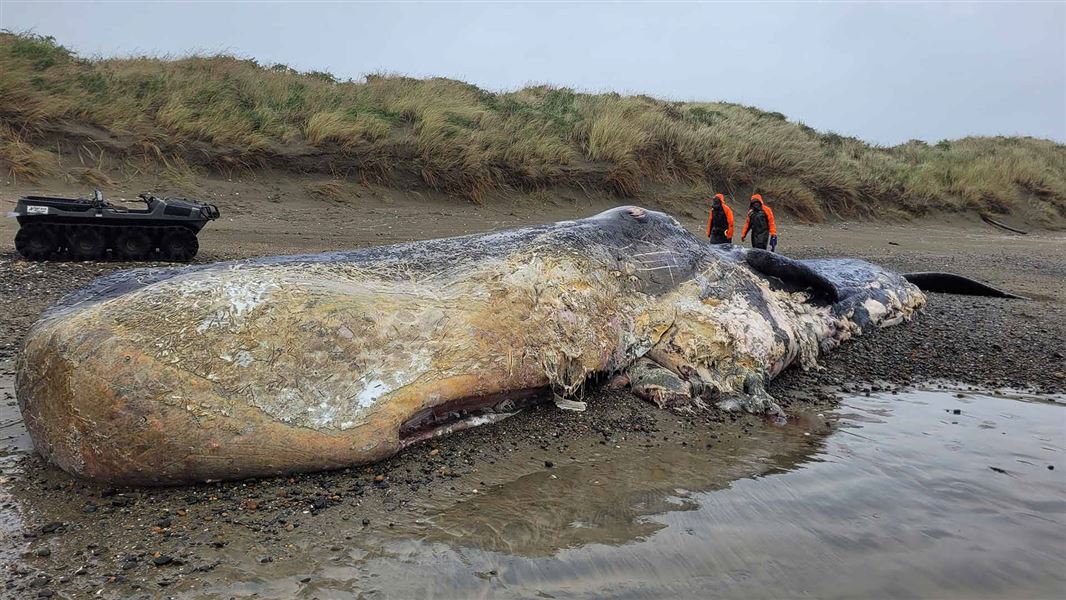 DOC Senior Ranger Rosalind Cole says a deceased 15-meter-long sperm whale washed ashore on a remote part of Oreti Beach, Southland last weekend.