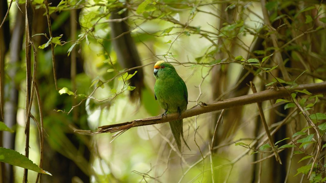 Kākāriki karaka, New Zealand’s rarest mainland forest bird, is a critically endangered parakeet species about the size of a korimako/bellbird.