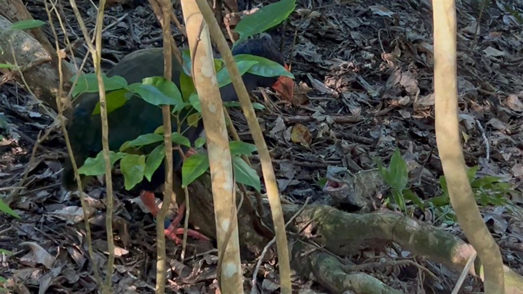 “I followed them down the hill, and the tuatara got a couple of bites in, so the takahē backed off and snuck back away up the forest,” says Nick.