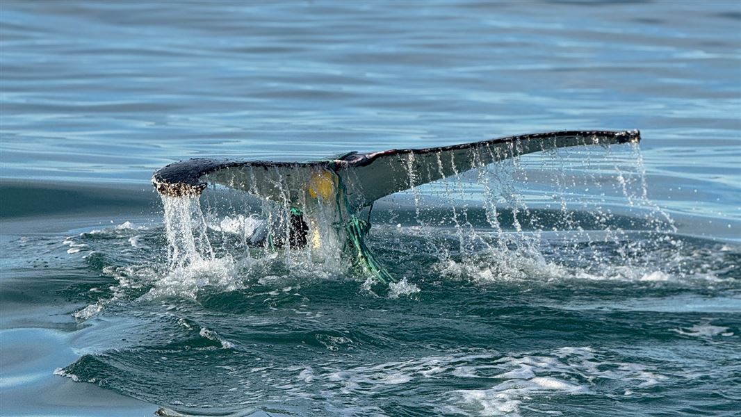 The juvenile to sub-adult humpback whale, estimated to be around 8–9 metres long, was first sighted around 9am on Sunday (15 June). It was caught in 12 mm braided cray pot line with a single float-gear that does not appear to belong to a local company-and was in immediate danger.