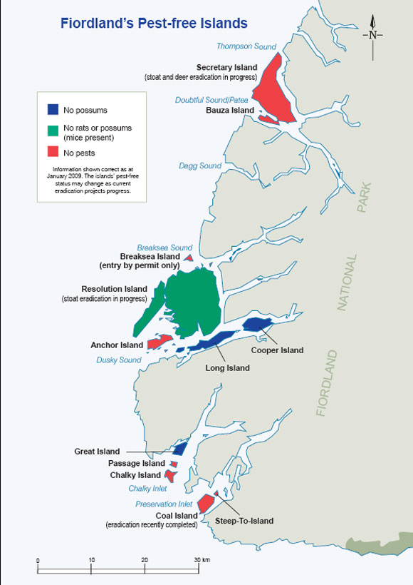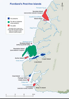 - Stoats (Te Kakahu/Chalky Island, 514 ha, 1999; Passage Islands, 189 ha, 1999; Anchor Island, 1130 ha, 2001; Bauza Island, 480 ha, 2002; Pigeon and Parrot Islands, 126 ha, 2005)