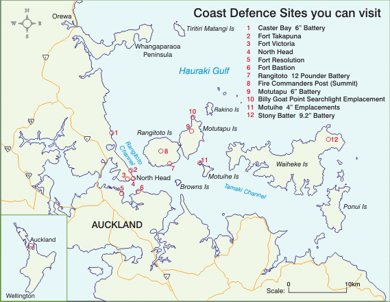 Fort Takapuna, North Head, Stony Batter on Waiheke Island, Motutapu Island, Rangitoto Island and Motuihe Island all played a key role in the defence of the Hauraki Gulf.