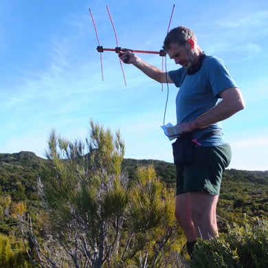 Every kākāpō wears a smart transmitter that emits a signal packed with behavioural data. We scramble over the islands, tracking the signals to collect the data and monitor the birds' locations.
