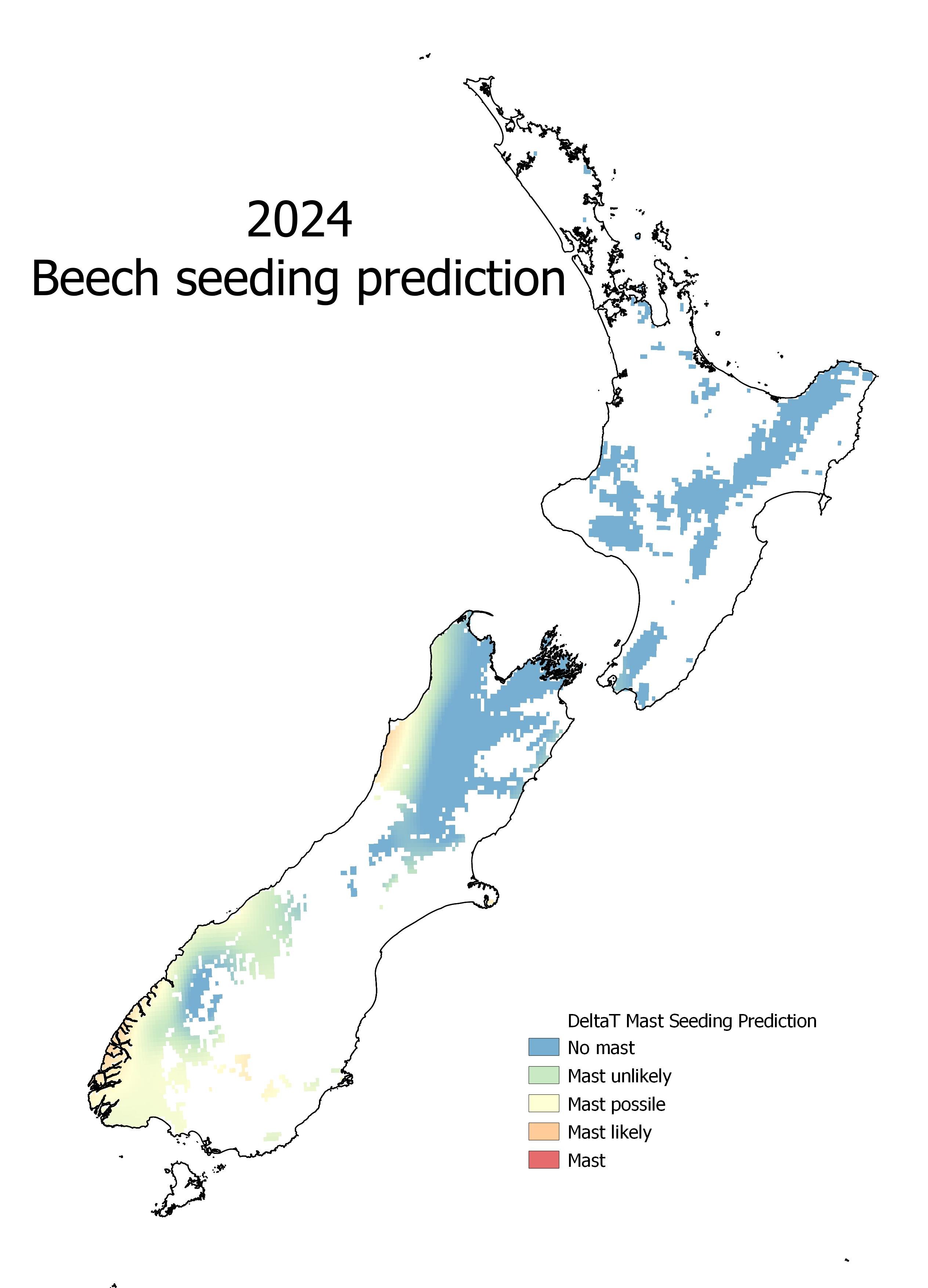 The DeltaT for 2026 suggests there will be significant flowering and seeding of beech trees in western and southern parts of the South Island in the summer of 2025/2026. Rodent and stoat plagues are likely in the following spring and summer. The heaviest seed fall is likely in parts of Fiordland. The predictions suggest there will be no significant beech seed fall in the North Island.