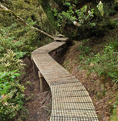 - Boardwalk constructed on the Ahukawakawa Track to prevent tripping on the tree roots and protect the trees in the area.