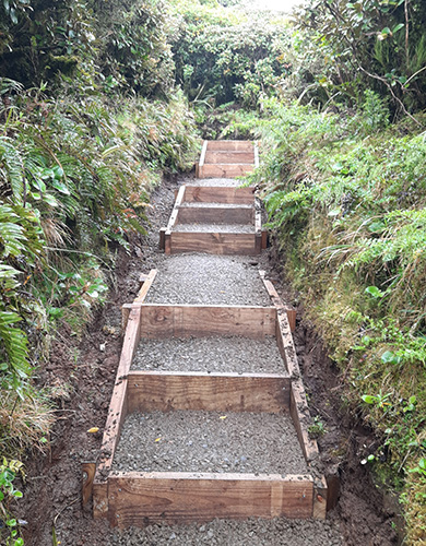 - Completed steps with rock formation on the North Egmont Camphouse to Jacobs Ladder Track. Stones from a local quarry (Waiwhakaiho) were placed next to the steps to prevent scouring and they highlight the track edge to prevent trips and falls