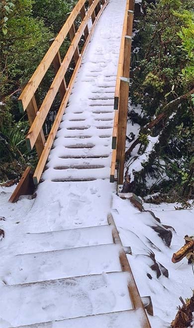 Wilkies Pool-Stratford Plateau Track works are 50% complete and have now paused for the winter months. A new footbridge at the headwaters of the Waingongoro Awa has been completed. A karakia with Ngāruahine and Ngāti Ruanui signified the opening of the bridge.