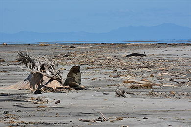 Some of the wildlife on our beaches can be quite camouflaged. That sleeping fur seal/kekeno, or sea lion/pakake can look a lot like a log or bit of driftwood from a distance. Visually scan the area so you are always one step ahead of your dog and you can plan where to walk.