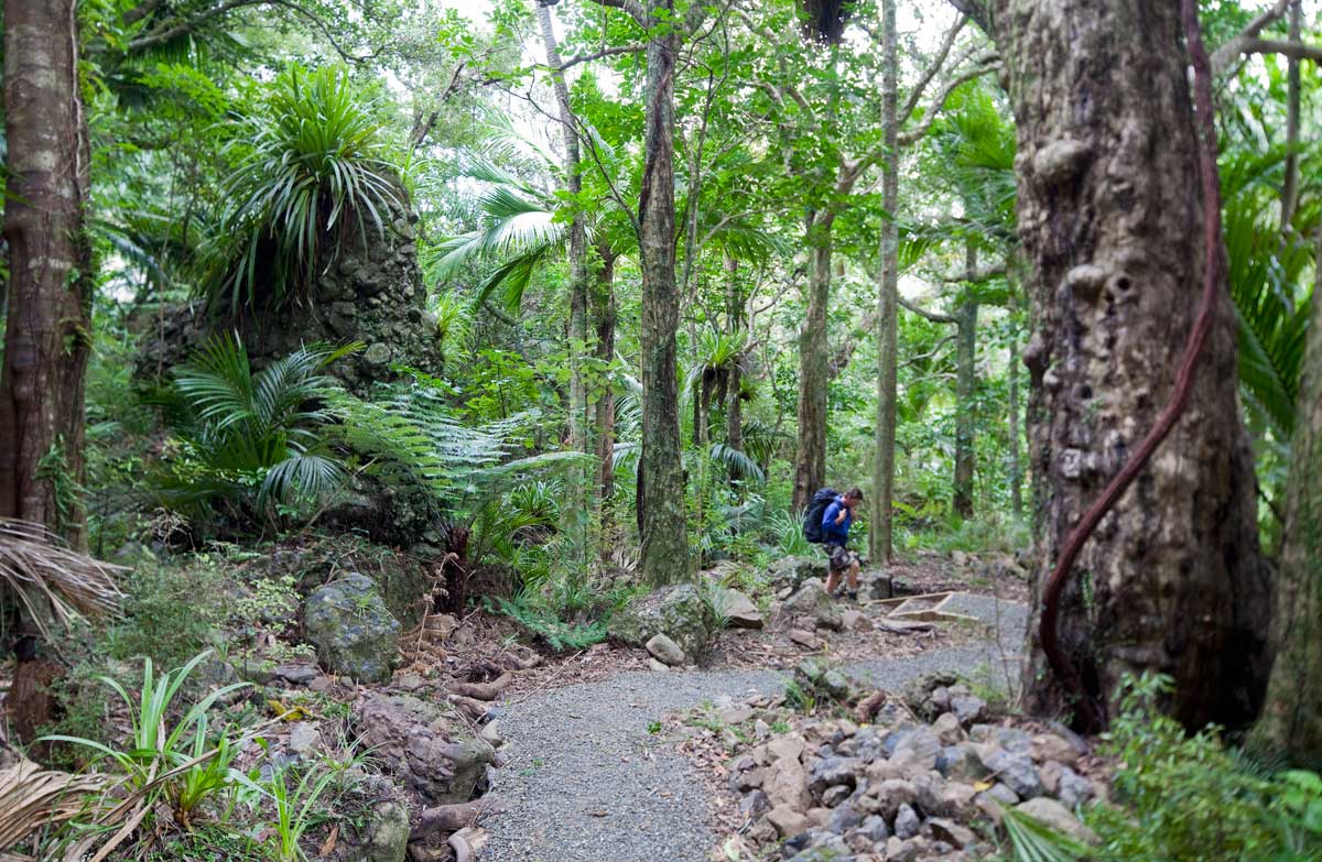 Starting from Whangaparapara Road, the Kaitoke Hot Springs Track begins flat and easy, following an ancient shoreline.