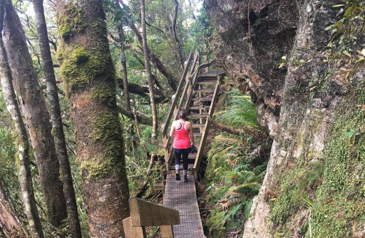 Nearing the summit, the track leads into mature forest where logging was too difficult and fires on the lower slopes did not reach. Remnants of an ancient and precious conifer forest, rimu, Kirk’s pine, pink pine and kauri, can be seen here.
