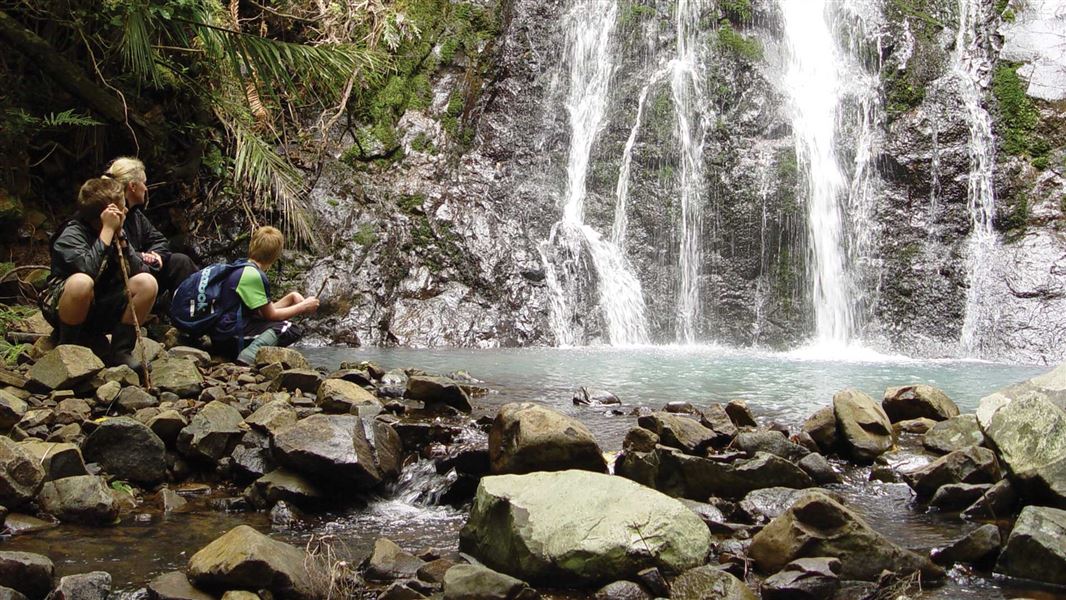 Warren’s Track is a gently graded climb to a waterfall. The stream offers deep pools good for swimming. It continues on through kauri plantation before joining Bridle Track, which leads to the FitzRoy store.
