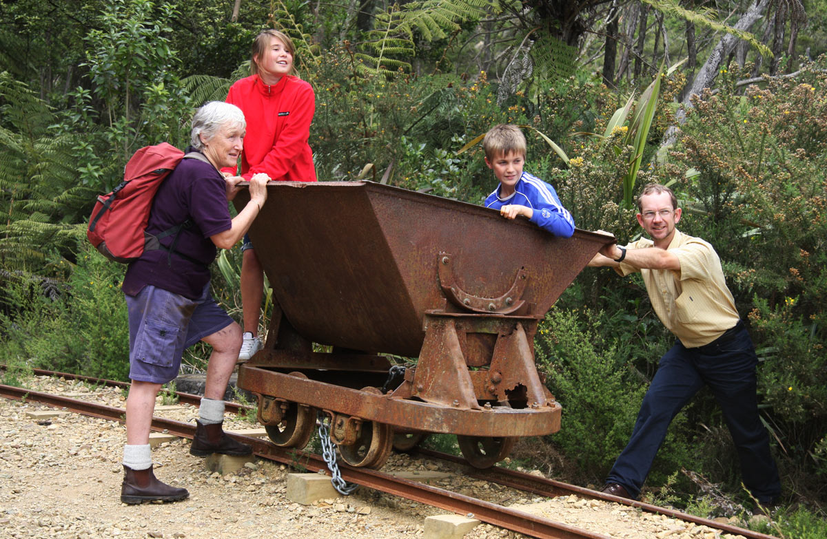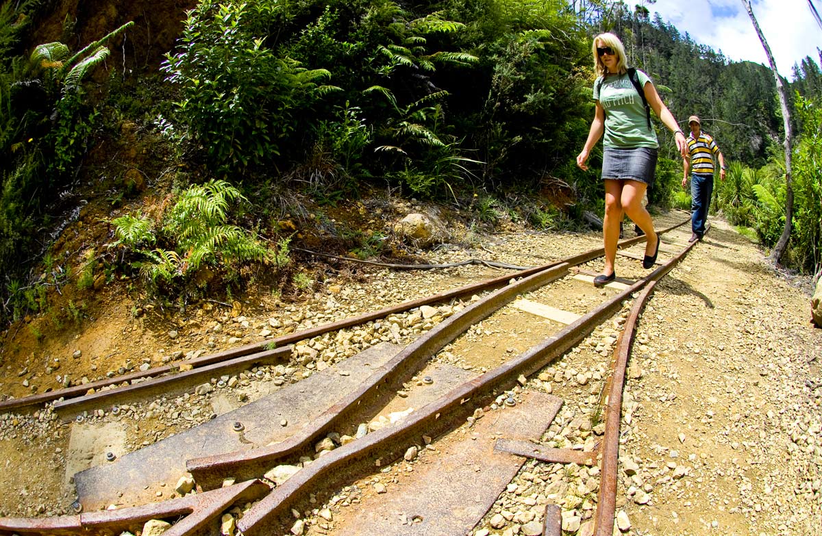 From the Karangahake Reserve car park begin by crossing both the suspension bridge over the Ohinemuri River, and then the Lower Waitawheta Gorge bridge. Go up the stairs and through the abandoned buildings and machinery of the Talisman battery.