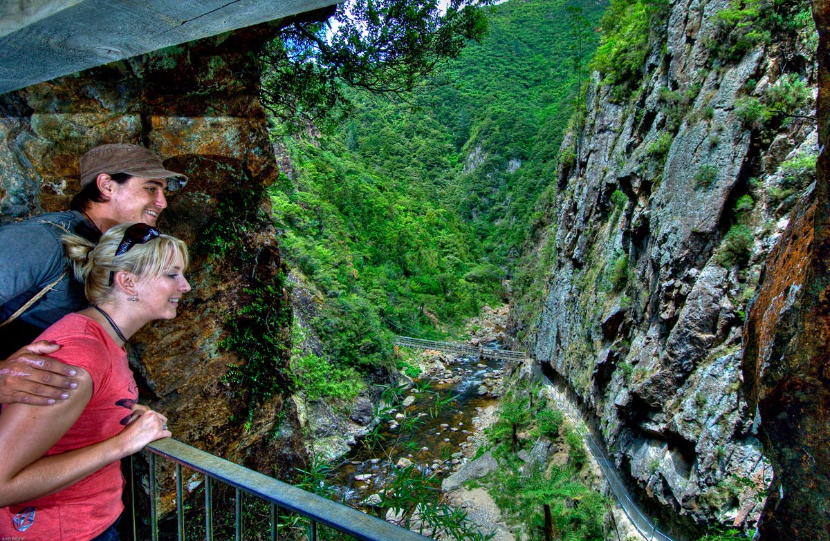 Then follow the rail track along the gorge and into the old gold mining tunnels. The tunnel has four openings (windows) which look down on the spectacular river gorge far below. The track emerges from the cliff and descends a staircase before crossing the river on a suspension bridge and returning on the opposite side of the gorge along the Crown Tramway Track to the car park.