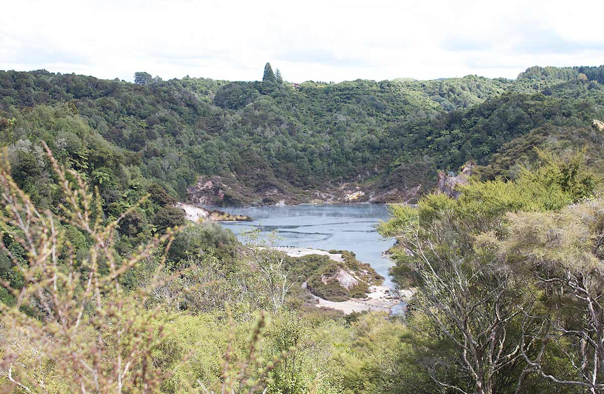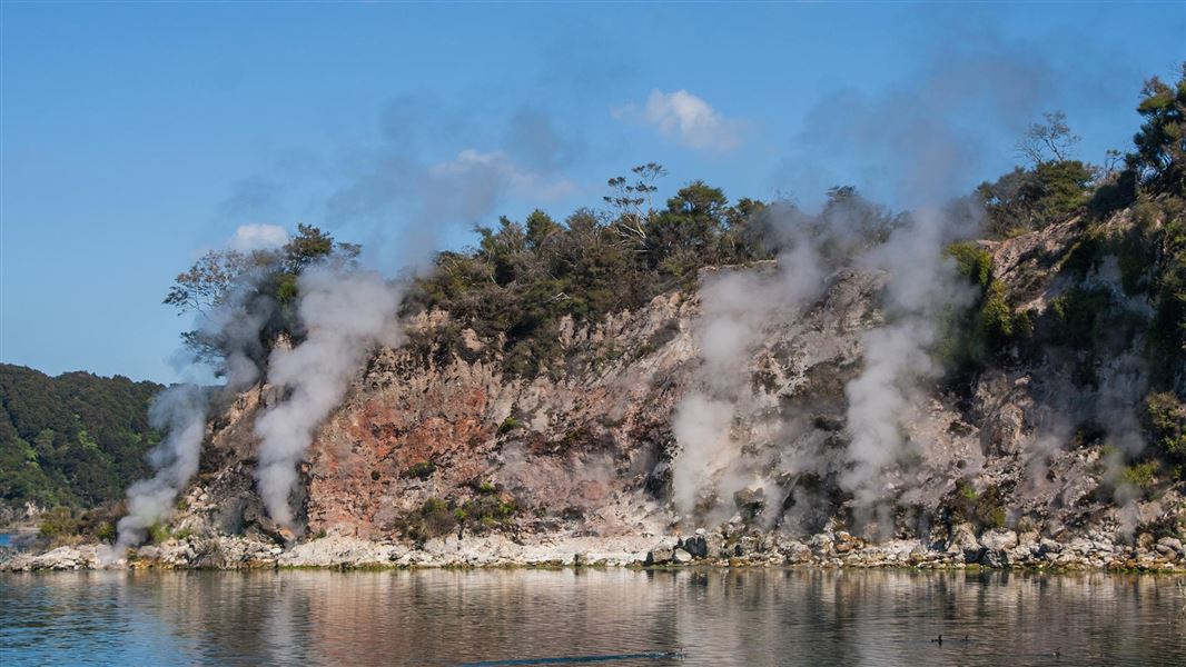 Lake Rotomahana was internationally famous for its spectacular Pink and White Terraces which were destroyed in the Mount Tarawera eruption of 1886. Steaming cliffs and silica terraces still remain as a feature of this lake.