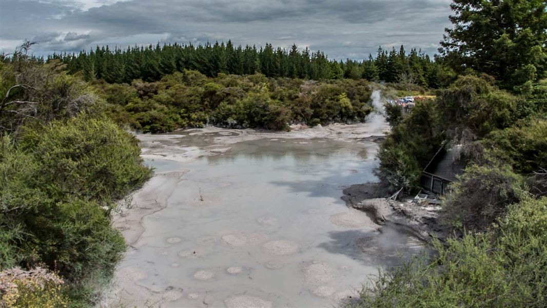 Waiotapu occupies the site of what was formerly the largest mud volcano in New Zealand. The original cone, present until 1925, is now eroded and vigorously active water and mud fill the pool.