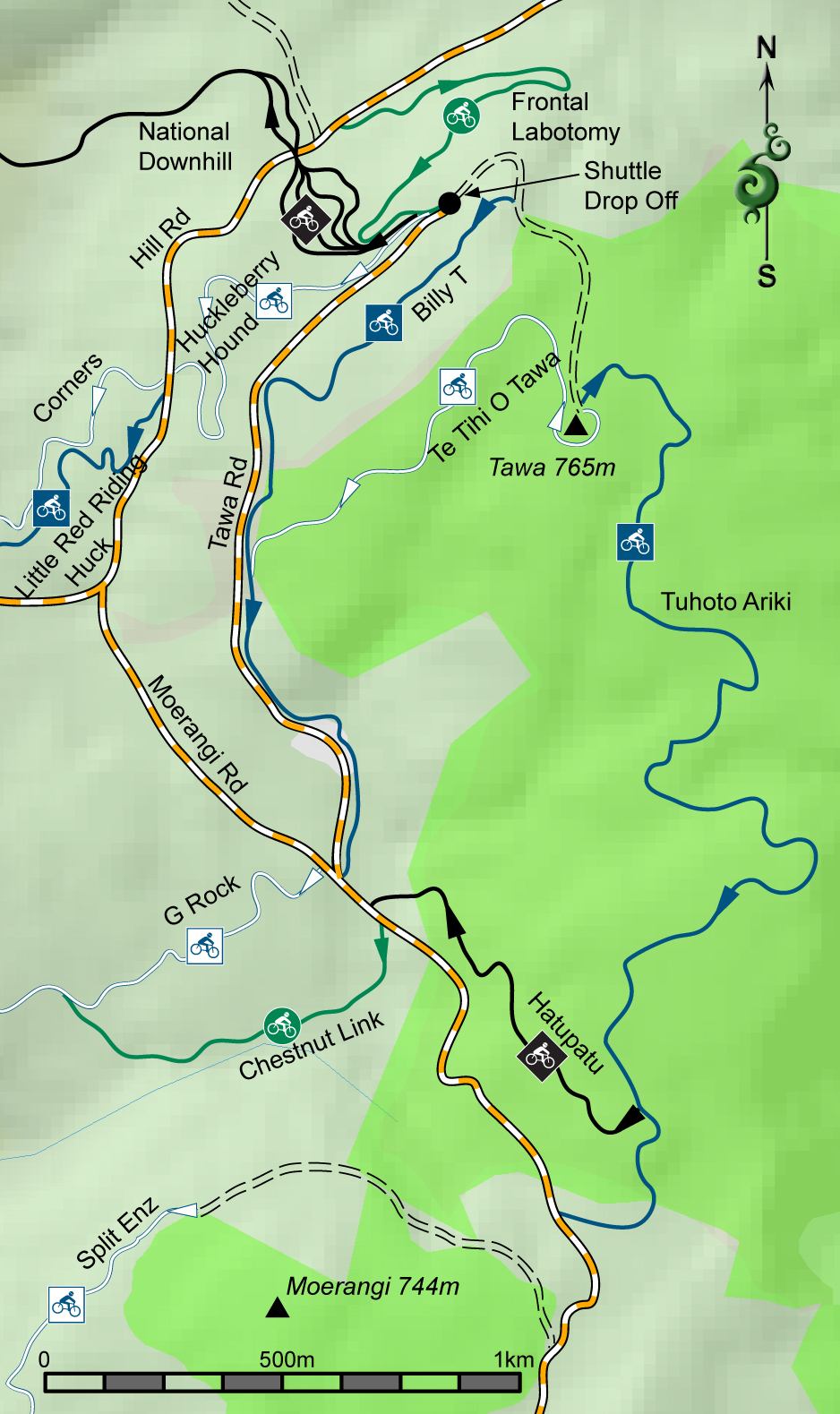 Running through mature forest containing, tawa, mahoe, five finger with mistletoe and juvenile rata. The surroundings means that Hatupatu provides an experience unlike other trails in the area. The trail is generally undulating but descends a total of 160 m over its 1 km distance. The grading comes from the off camber benching and roots, not the steepness of the descent. A challenging ride for those who like technical trails.