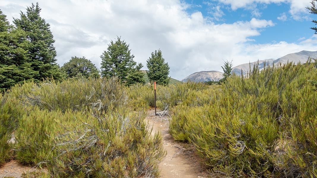 Once through the bush, the track traverses a tussock area and some more forest and then drops into Timms Stream. After climbing out of the stream, the track arrives at Texas Flat on the Cheeseman Ski Field Road.