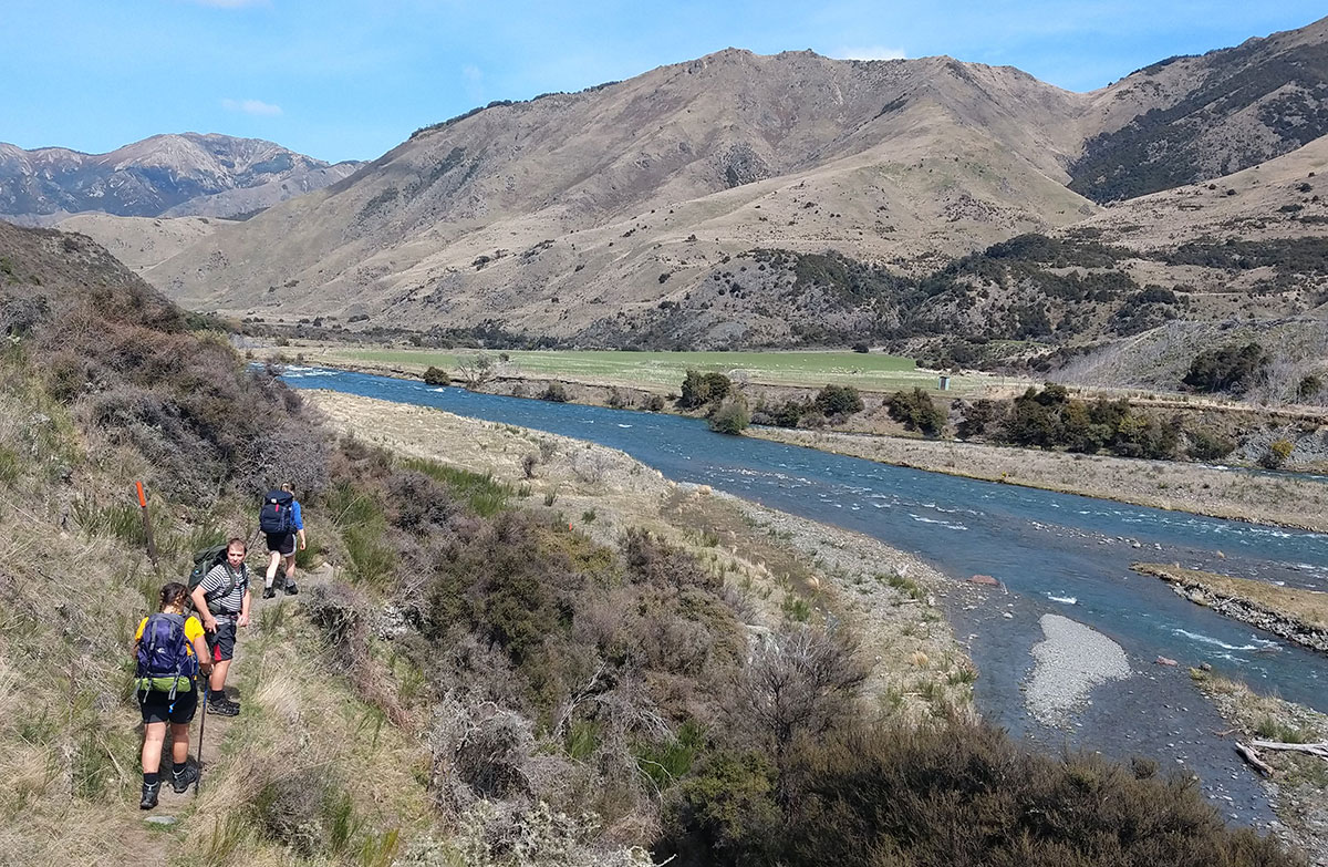 After crossing Cold Stream, gravel flats lead to a short gorge. The valley starts to close in, with sections of track appearing intermittently between frequent stream crossings. Eventually the track breaks out onto narrow grassy flats leading to the Hurunui River. Cross the river via the swing bridge just below the Jollie Brook / Hurunui confluence.