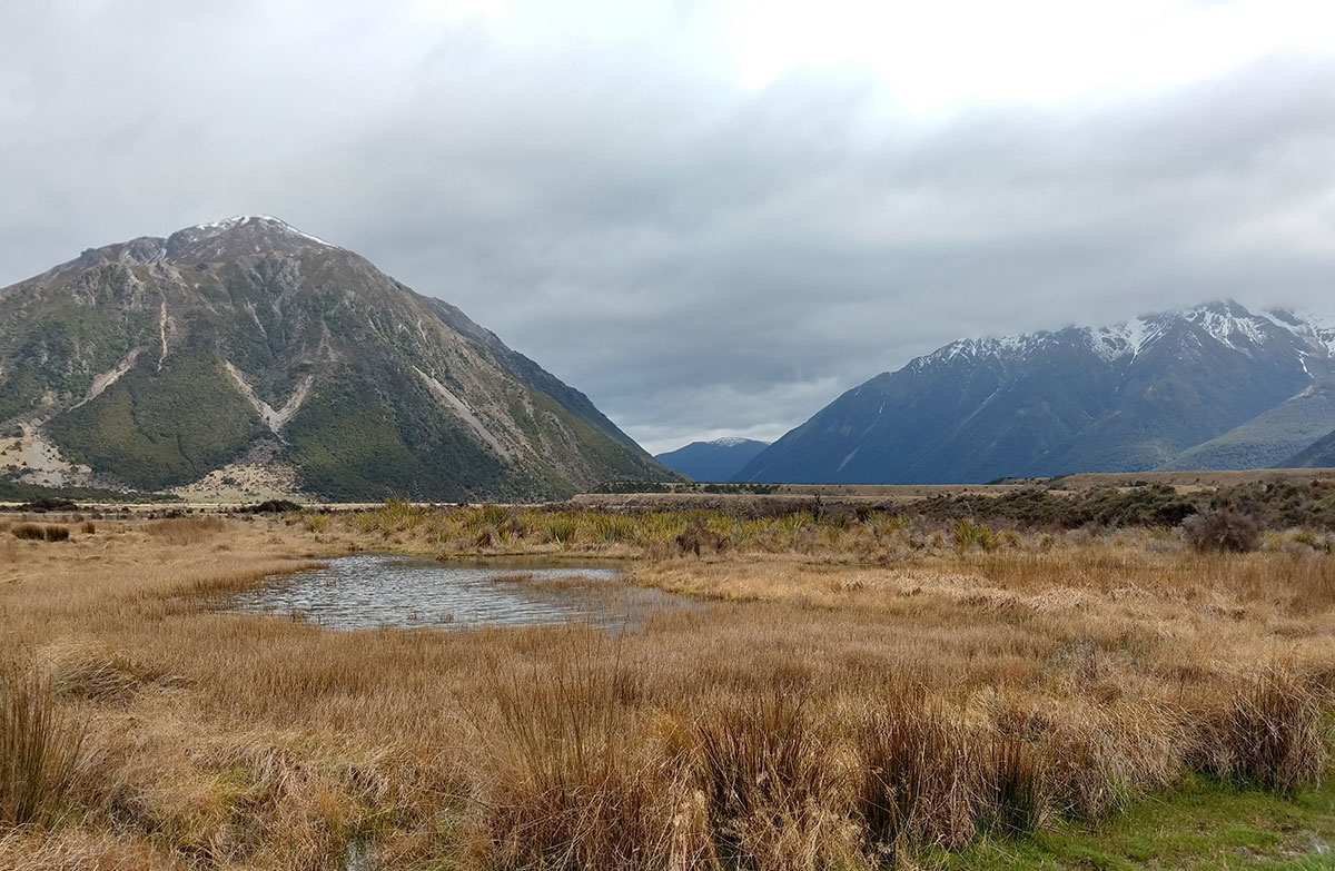 The track downstream from the hut is well marked but there are a few crossings back and forth across the river. When the valley opens out, traverse across grass and gravel flats until you reach the junction with Cold Stream.
