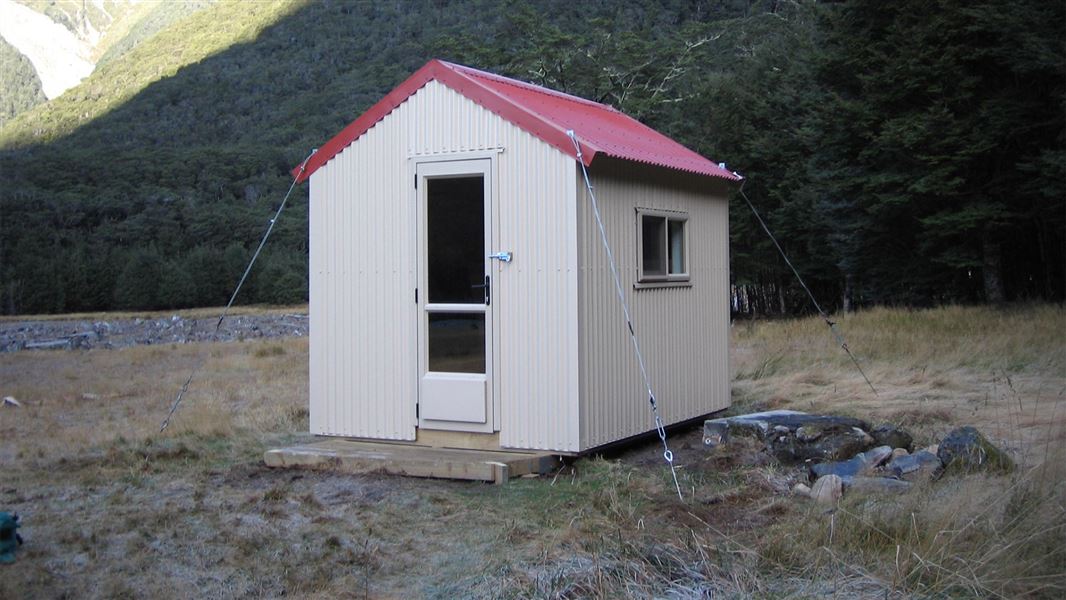 Officers Hut is directly next to Huxley Forks Hut (20 m apart).