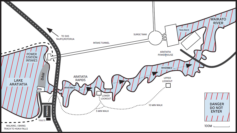 Stay out: Keep clear of the Aratiatia Rapids spillway and downstream area at all times. Never enter, swim or kayak in this area.
