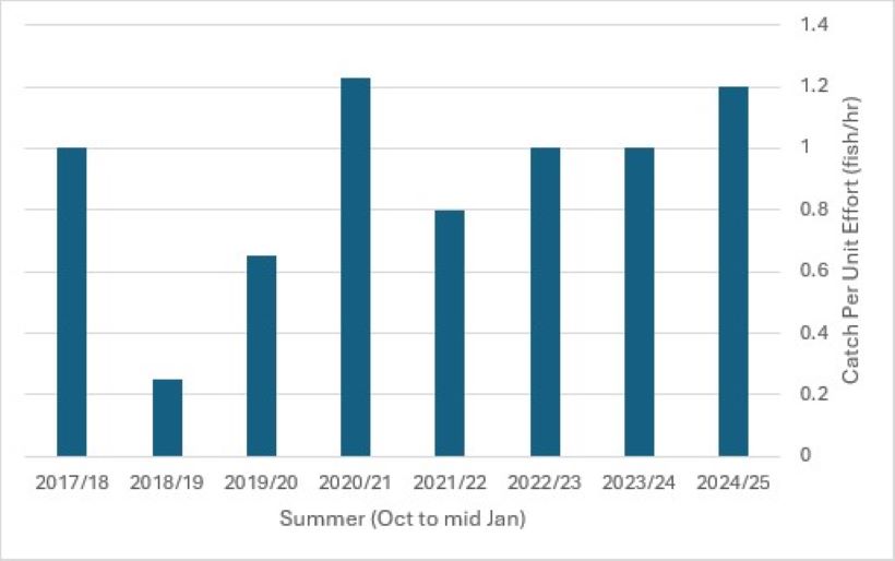 The estimated catch rate for the 2024/25 period was very good at 1.2 fish per hour (one legal sized trout every 50 minutes) and is up in comparison to recent years (Fig. 1).
