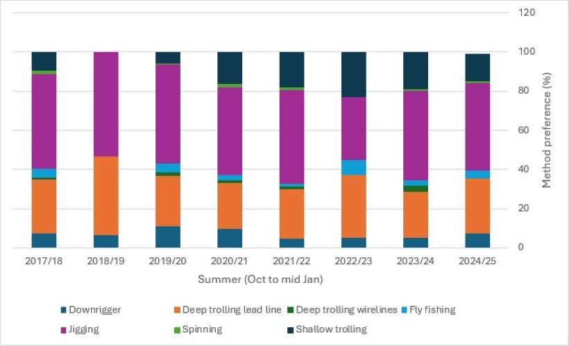 Figure 2: Preferred fishing method for the summer period on Lake Taupō from 2017/18 to 2024/25. | DOC