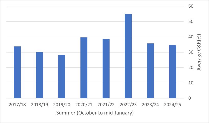 The average catch and release percentage sits at 34.8% for 2024/2025 which is similar to 35.8% for the previous summer.