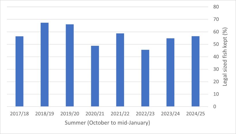 The percentage of legal sized fish kept in 2024/2025 reached 56.5%. This indicates that anglers have kept more of the bigger fish that they have caught, helping to increase the overall harvest of legal sized fish in 2024/2025 (Fig. 4).