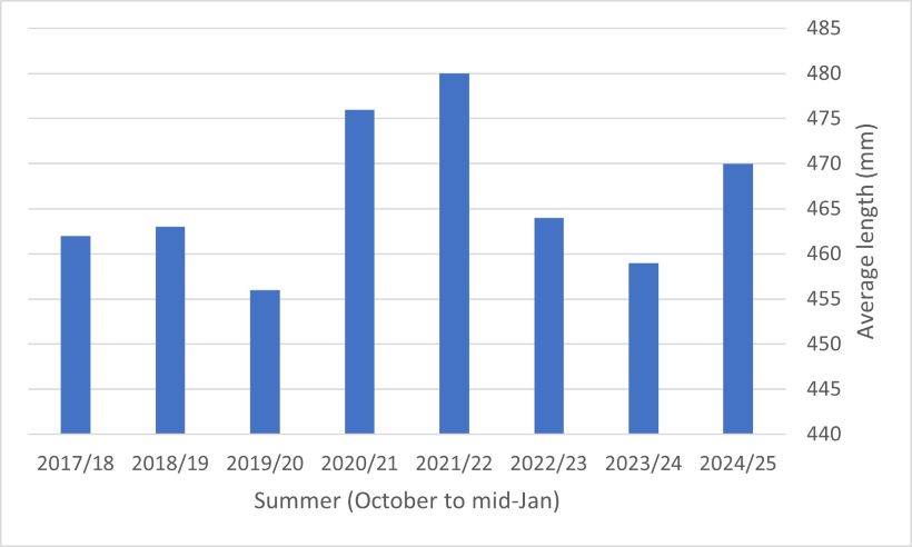 Figure 5: Average length of maiden rainbows kept by anglers on Lake Taupō for the summer period from 2017/18 to 2024/25. | DOC